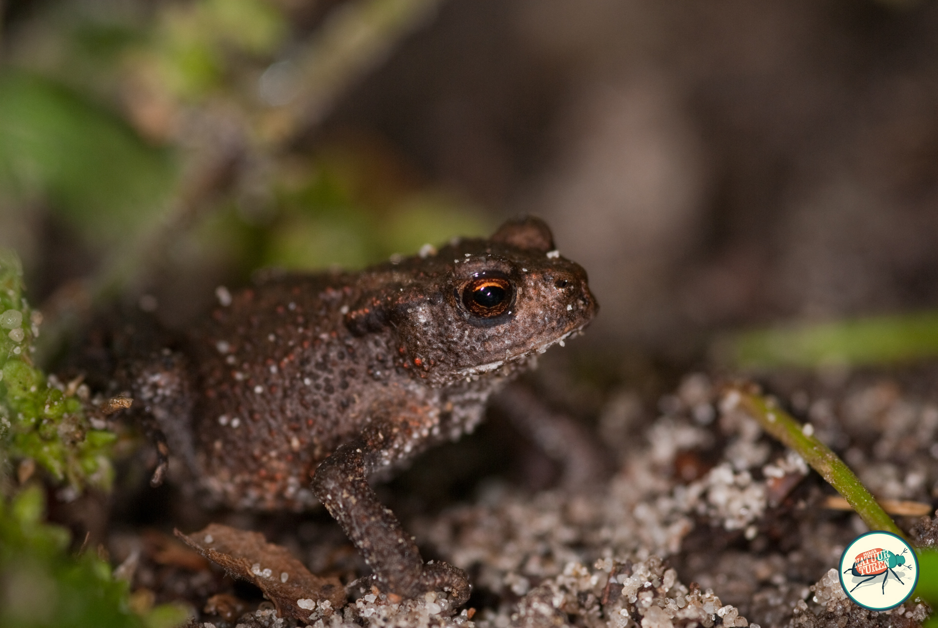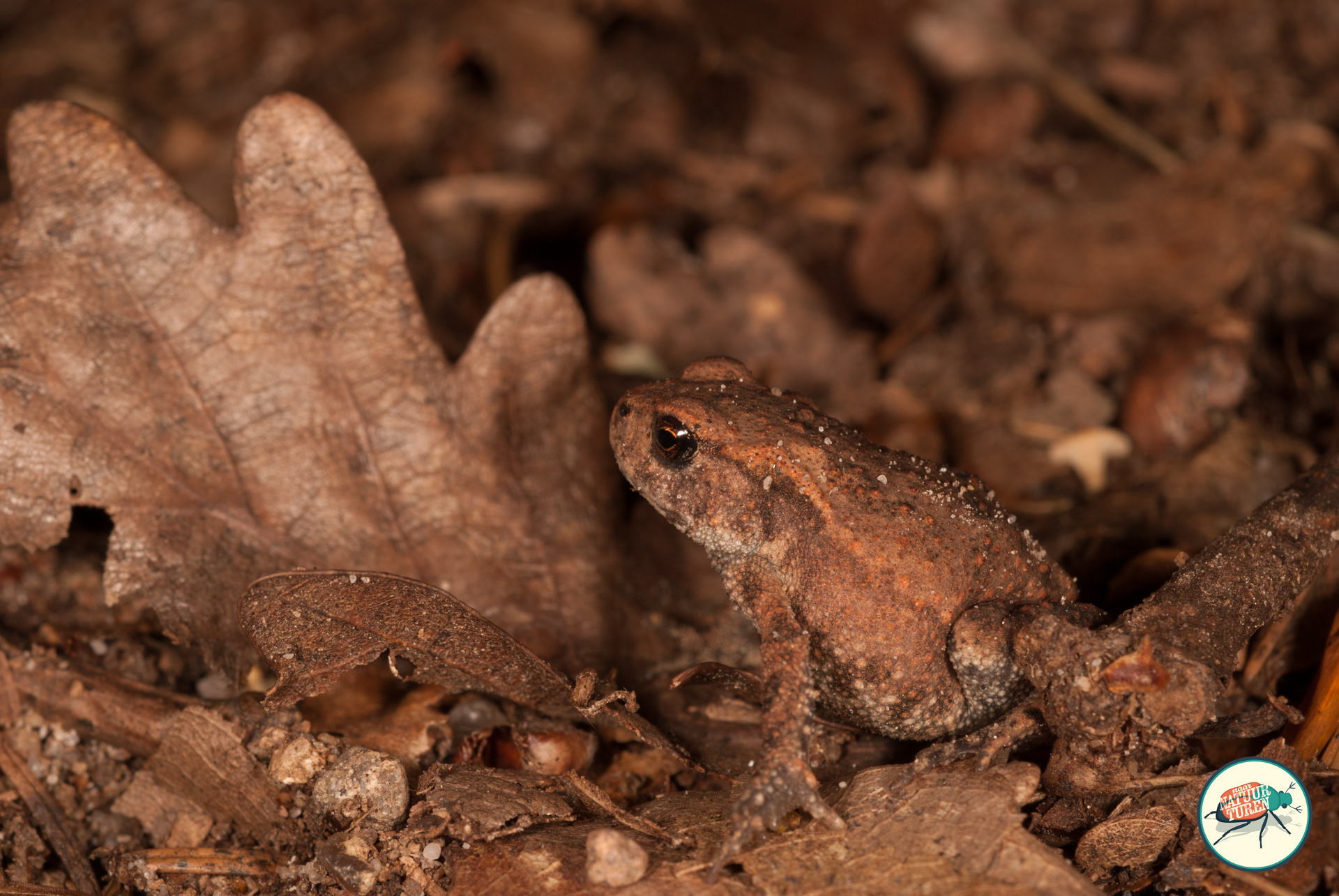 Bruine kikker houdt zich schuil tussen het mos.